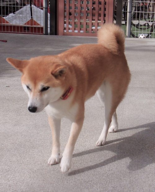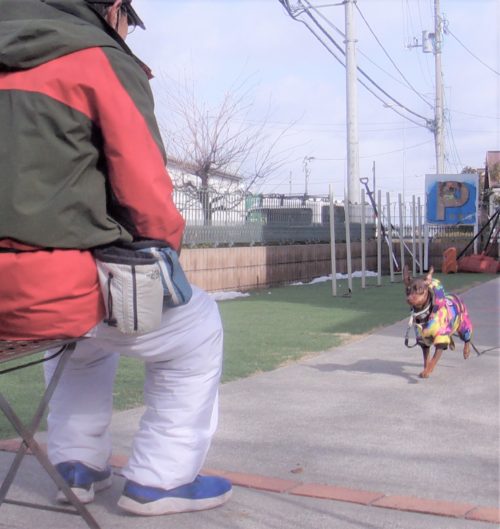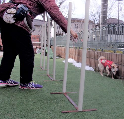 伏臥から停座! 行進中の停座! 紐無脚側行進(ベタ付け歩行!)! 停座から伏臥! 立止待て1周! イス作業、招呼! センター(対面停座)! スラローム(練習中)!