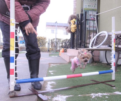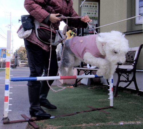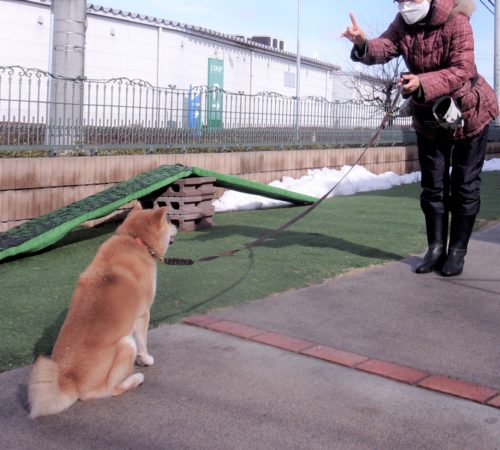 遠隔、立止から停座! 停座から伏臥! 立止から伏臥! 招呼! 停座待て1周! ハードルジャンプ(40㎝)! 15㎝! イス作業、遠隔、停座から伏臥!