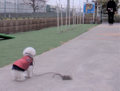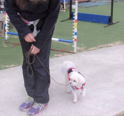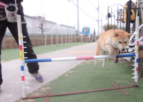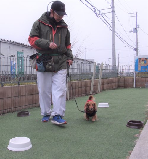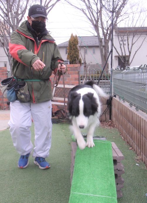 脚側停座、Uターン! 行進中の停座! 遠隔、立止から停座! スロープ通過! Uターン! 食器8の字! ハードルジャンプ(40㎝)!