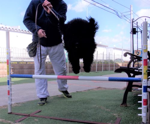 停座待て1周! 緩歩! 遠隔、伏臥から立止! 歩行訓練! ハードルジャンプ 40㎝(低め)! 40㎝!