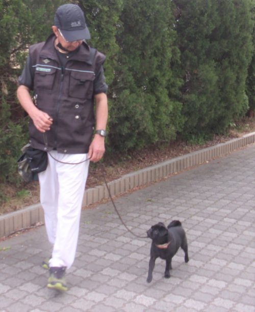 行進並びに停座! 伏臥待て離れて30秒! 歩行訓練! 脚側停座 Uターン! 呼吸を合わせて歩き出し! グレーチング通過!