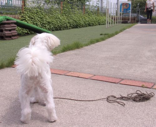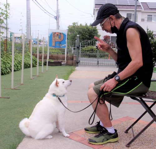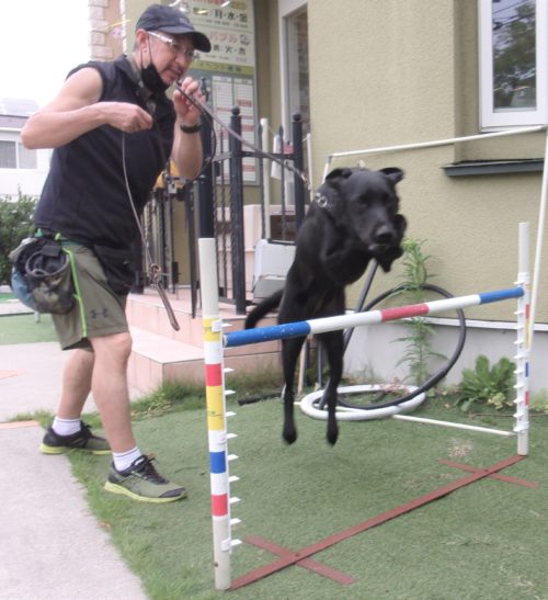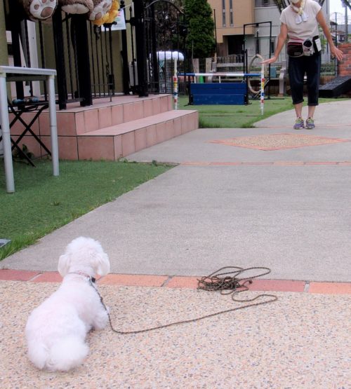 停座から立止! 立止待て離れて30秒! ドイツターン! 伏臥待て大きく1周! ハードルジャンプ(60㎝)! 遠隔、立止から伏臥! イス作業、センター! 伏臥待て離れて30秒!