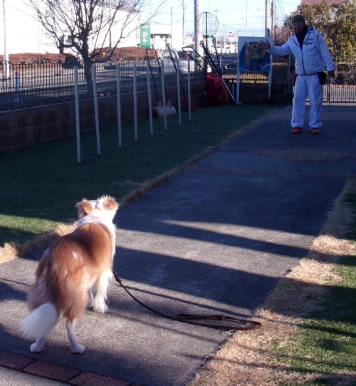 立止待て1周! 同一方向 停座から伏臥! 遠隔、伏臥から立止! 紐付き脚側行進! 行進中の回れ!