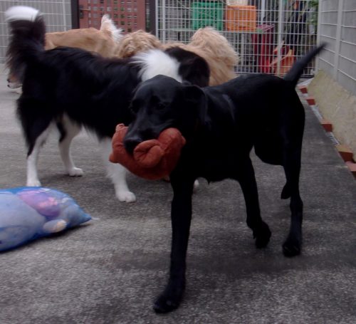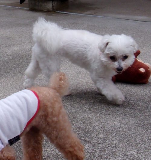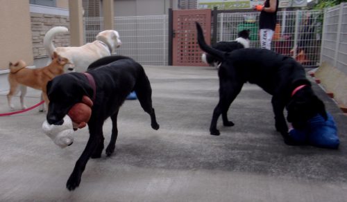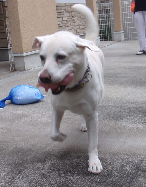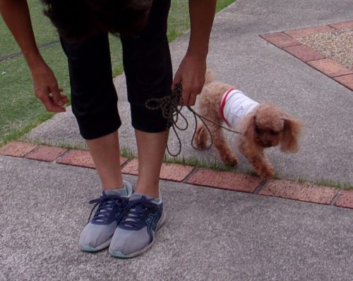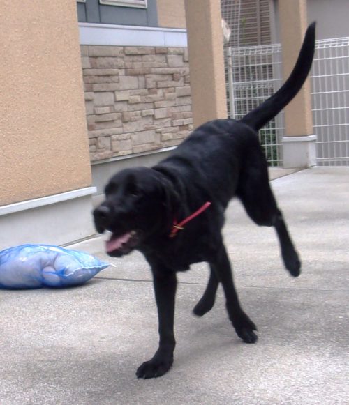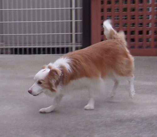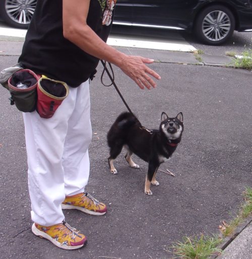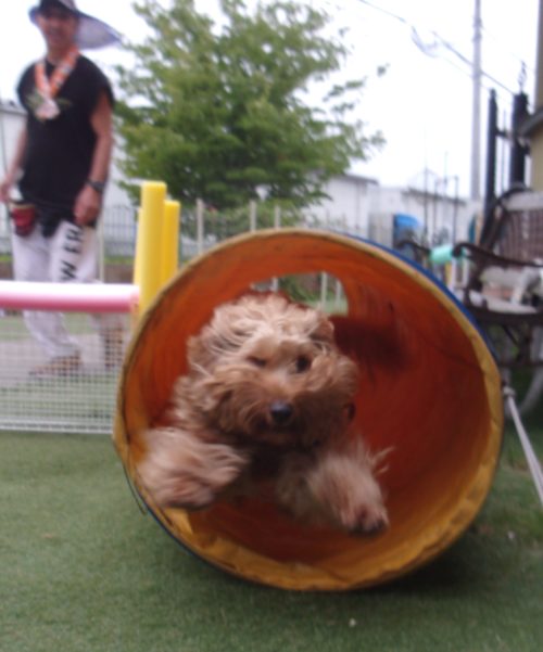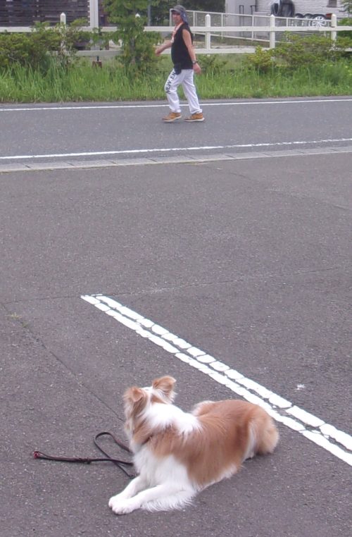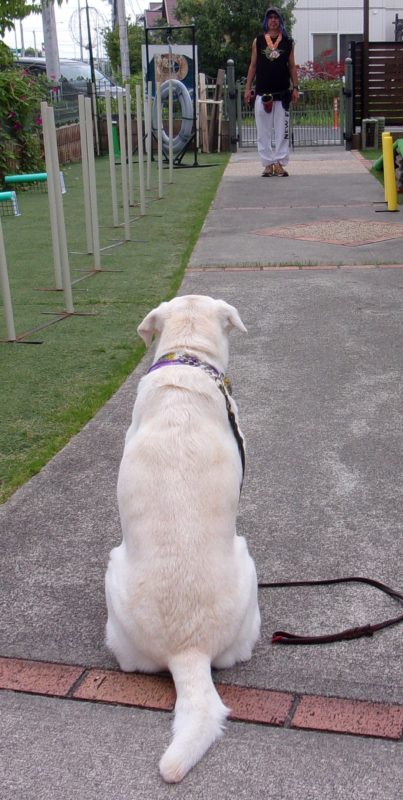 「にっこ」前のアイコンタクト! ラリオビ、ラウンド! 据座(停座待て離れて30秒)! 紐無脚側行進! 伏臥待て大きく1周! ラリオビ、トンネル通過!