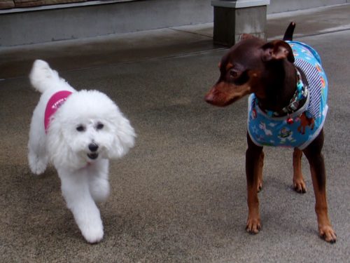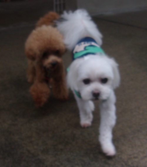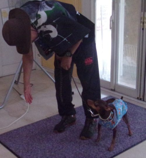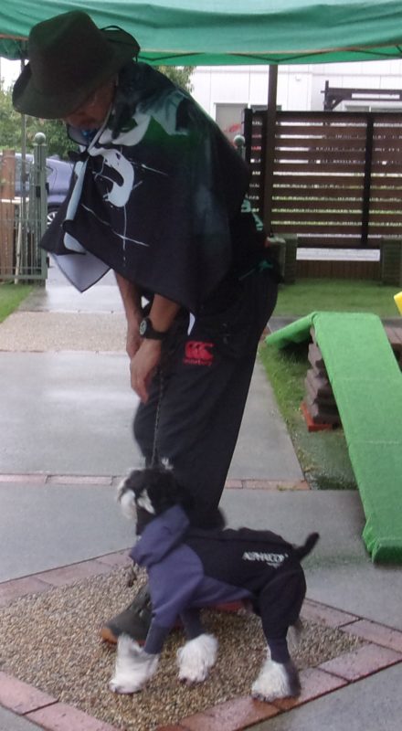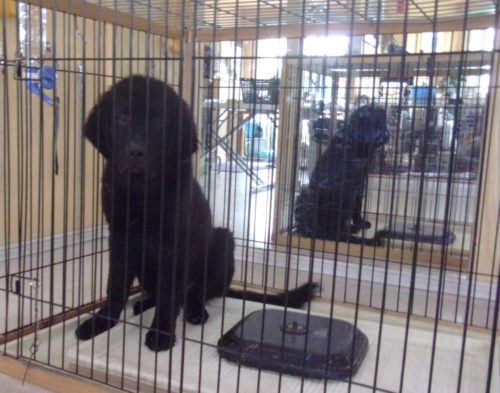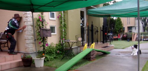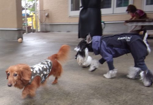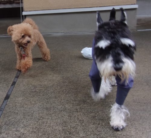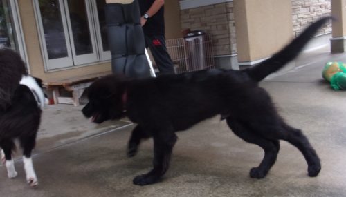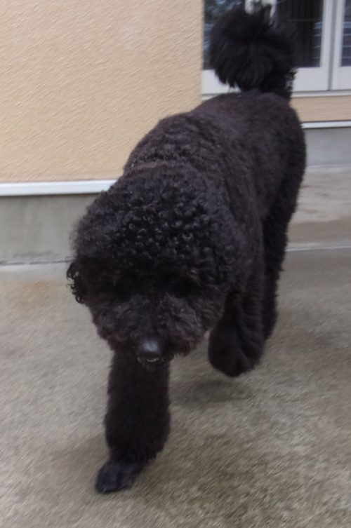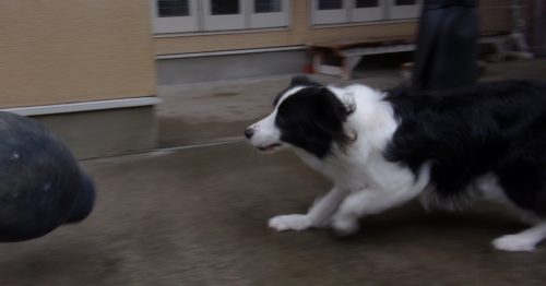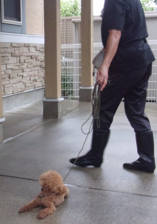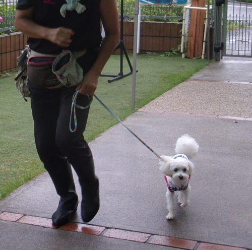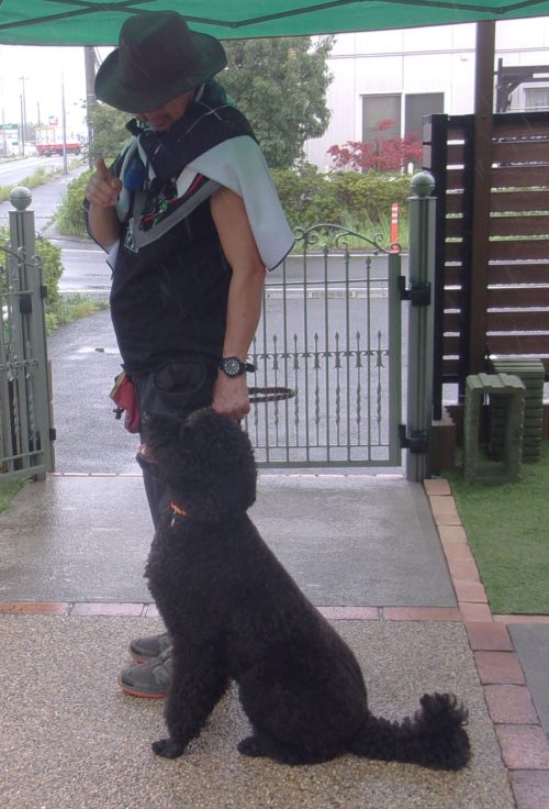右回りUターン! 伏臥待て1周! 伏臥から立止! 速歩! 伏臥から停座! イス作業、立止から停座! 休止!