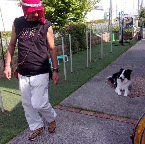 伏臥待て大きく1周! 伏臥から停座! 立止待て大きく1周! 緩歩! 行進中の伏臥!