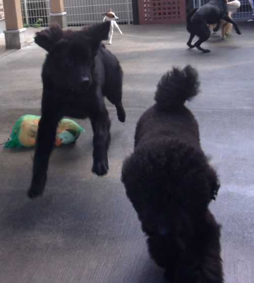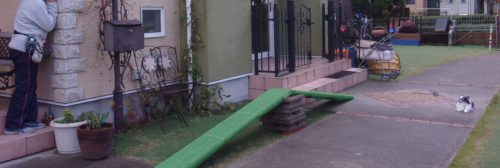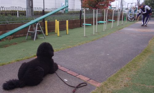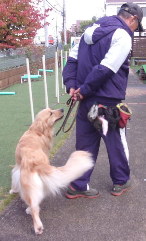 脚側停座、一歩後ろ! 遠隔、立止から伏臥! 休止! ドイツターン!